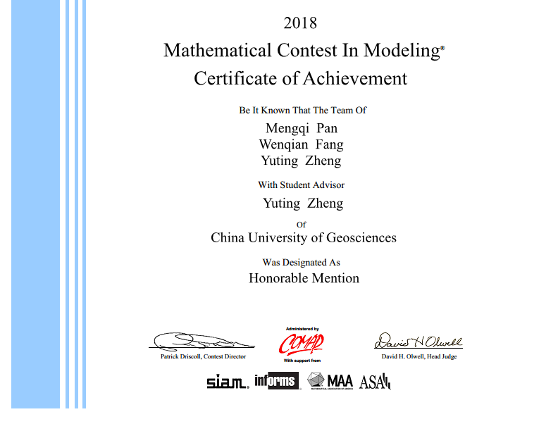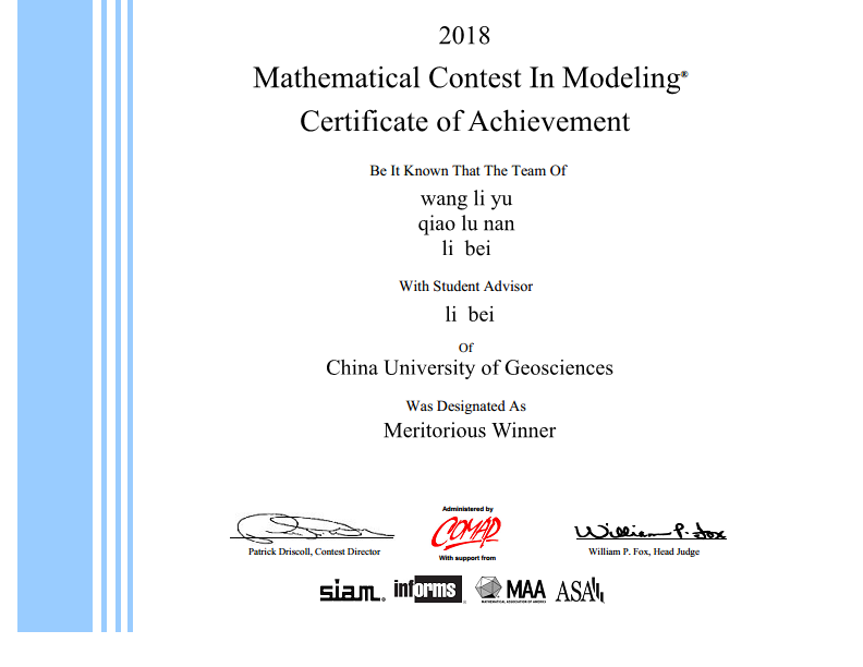 在与众多名校参赛队的激烈角逐中,我校beat365在线体育官网登录入口三名同学李贝(2016级硕士计算机科学与技术专业)、乔璐楠(2016级硕士计算机科学与技术专业)、王利宇(2017级硕士计算机科学与技术专业)获得了该项赛事一等奖(Meritorious Winner)。另外,beat365在线体育官网登录入口潘孟琦(2016级硕士计算机科学与技术专业)、数理学院方文倩(2017级硕士信号处理与智能计算)、beat365在线体育官网登录入口郑雨婷(2017级硕士计算机科学与技术专业)三位同学获该项赛事二等奖(Honorable Mention)。