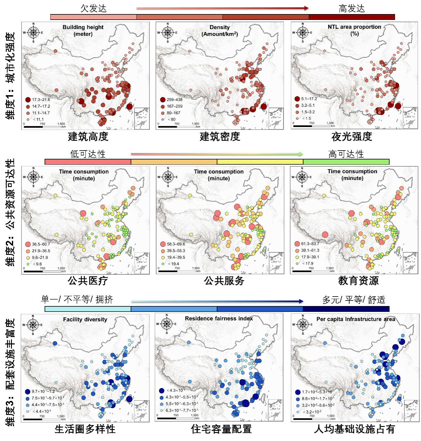在此基础上,团队进一步构建了15分钟生活圈、交通可达性、住宅容量配置等九项建成环境评估指标,基于每栋建筑的社会功能,从城市化强度、公共资源可达性和配套设施丰富度三个维度出发,对不同城市等级、不同地理区域和市内不同片区的建成环境差异进行系统性评估。研究结果显示:1)在城市等级层面,一线、新一线城市在教育、医疗和社区服务等公共资源可达性以及配套设施丰富度方面明显占优,但二三线城市在住房资源分配上更加均衡。2)在地理区域层面,南方城市在公共资源可达性方面整体表现最佳,但人均占有量较少,东北、西北城市在配套设施丰富度方面存在明显不足。3)在城市内部,相较于城市核心区,新建城区则呈现更大的建成环境不均衡性。