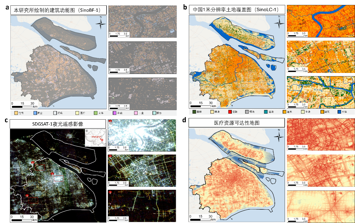 图3 (a)本研究绘制的建筑功能图(SinoBF-1);(b)团队23年绘制的1 米土地覆盖图(SinoLC-1);(c)夜光遥感影像(SGDSAT-1);(d)本研究结合建筑功能图、路网数据、土地覆盖图生成的上海医疗设施可达性地图