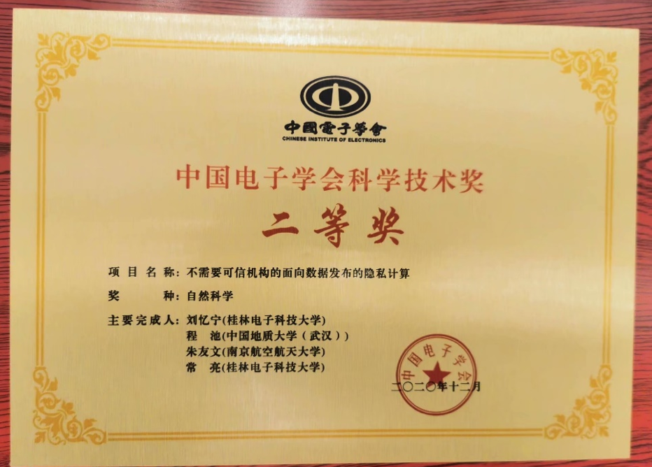 (通讯员:章丽平)2021年4月17-18日,中国电子学会2020年度科学技术奖励大会在重庆举行。beat365在线体育官网登录入口信息安全系程池老师与桂林电子科技大学、南京航空航天大学的学者共同完成的“不需要可信机构的面向数据发布的隐私计算”荣获2020年度中国电子学会科学技术奖自然科学二等奖。郝跃院士、刘明院士等23位院士出席大会并颁奖。