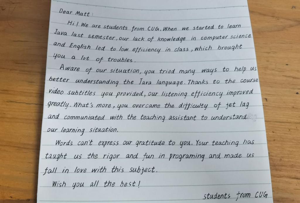 尊敬的Matt老师,还记得我们最开始学习Java的时候,计算机知识的匮乏以及语言不通导致上课效率较低,给我们和您带来了很大的困扰,您想尽一切办法帮助我们掌握课堂知识。您提供的课程视频字幕,极大地提高了我们的听课效率;您克服时差困难与助教老师进行交流,了解我们的学习情况。言语已经无法表达我们对您的感激之情,您的教诲让我们知道了编程的严谨和乐趣,让我们爱上这门学科,并不断为之付出努力。