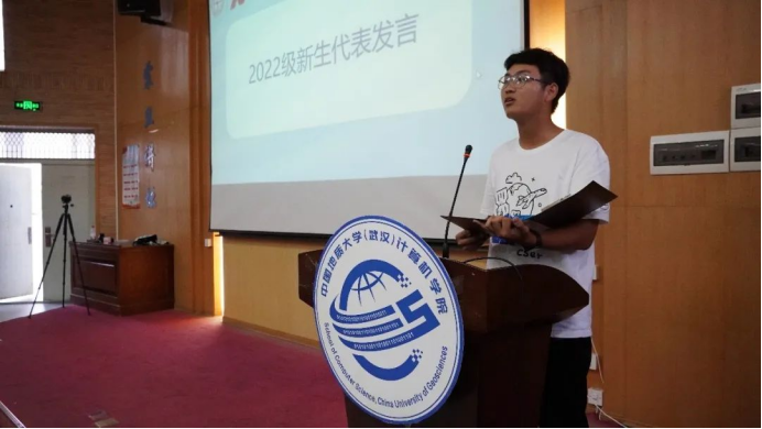 2022级新生代表张瑾涵发言。他怀着昂扬的心情表达对学院、老师、学长学姐的感谢,并号召同学们在时代和技术的更迭中下定决心、坚持恒心、保持初心,以成为一名合格计科人为奋斗目标,励科技强国之志,以“青春”之我奋斗“青春”之国,为国家做出计科人的贡献。