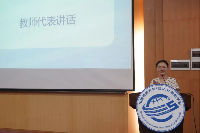 优秀教师代表杨帆发言。她表示大学和高中的不同主要在学习目标、特点、方法,并围绕专业特点、发展趋势向同学们表达了自己的殷切期盼,希望广大同学及时适应大学学习环境、转变学习思维,戒骄戒躁、见贤思齐,把握时代赋予的挑战和机遇,在地大的奋斗中展现青春的光芒。
