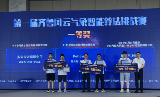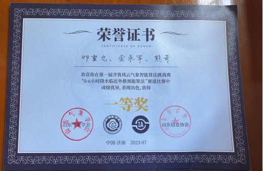 7月15至16日,由山东气象学会、浪潮数字(山东)建设运营有限公司、山东信息协会联合主办的第一届齐鲁风云气象智能算法挑战赛决赛及颁奖仪式在济南完美收官。历经初赛、复赛、决赛的层层选拔和激烈角逐,beat365官网教师刘佳指导的研究生邓重九、金永军、熊奇组成的团队获得“0-6小时降水临近外推预报算法”赛道一等奖。