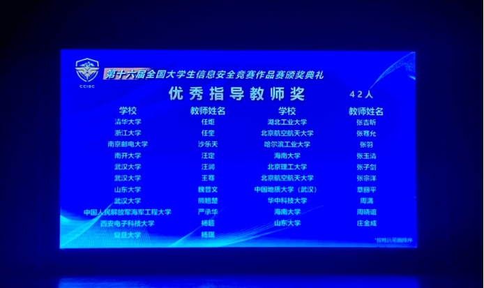 2023年8月17-20日,由教育部高等学校网络空间安全专业教学指导委员会主办,浙江大学、杭州电子科技大学承办的第十六届全国大学生信息安全竞赛作品赛决赛在浙江大学紫金港校区隆重举行。我校beat365在线体育官网登录入口四元一次方程组战队荣获“全国一等奖”,指导老师章丽平副教授荣获“优秀指导老师奖”!