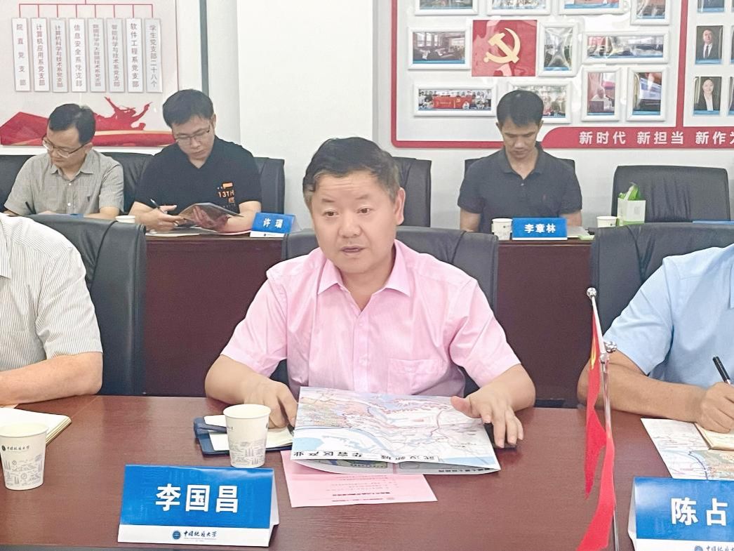 任蔚对学院的热情接待表达感谢,并介绍了鄂州市人民政府在武汉华容区建设武汉新城与光谷数字信息产业园招商的进度。表达了未来与beat365在线体育官网登录入口的合作意向,表示这次调研旨在了解学院学科建设,希望可以运用计算机专业相关数字环保、数字经济等方式推进城区建设。