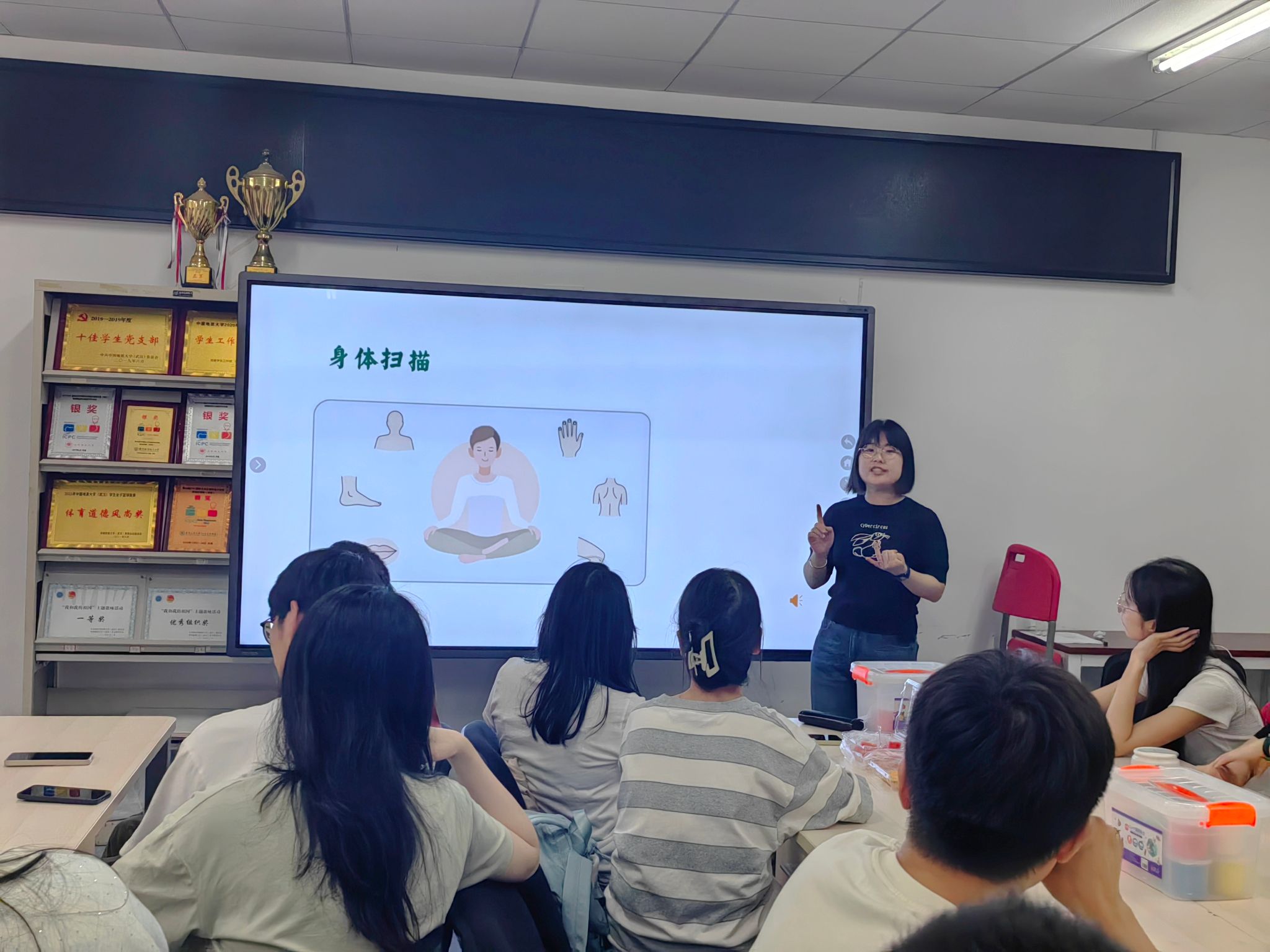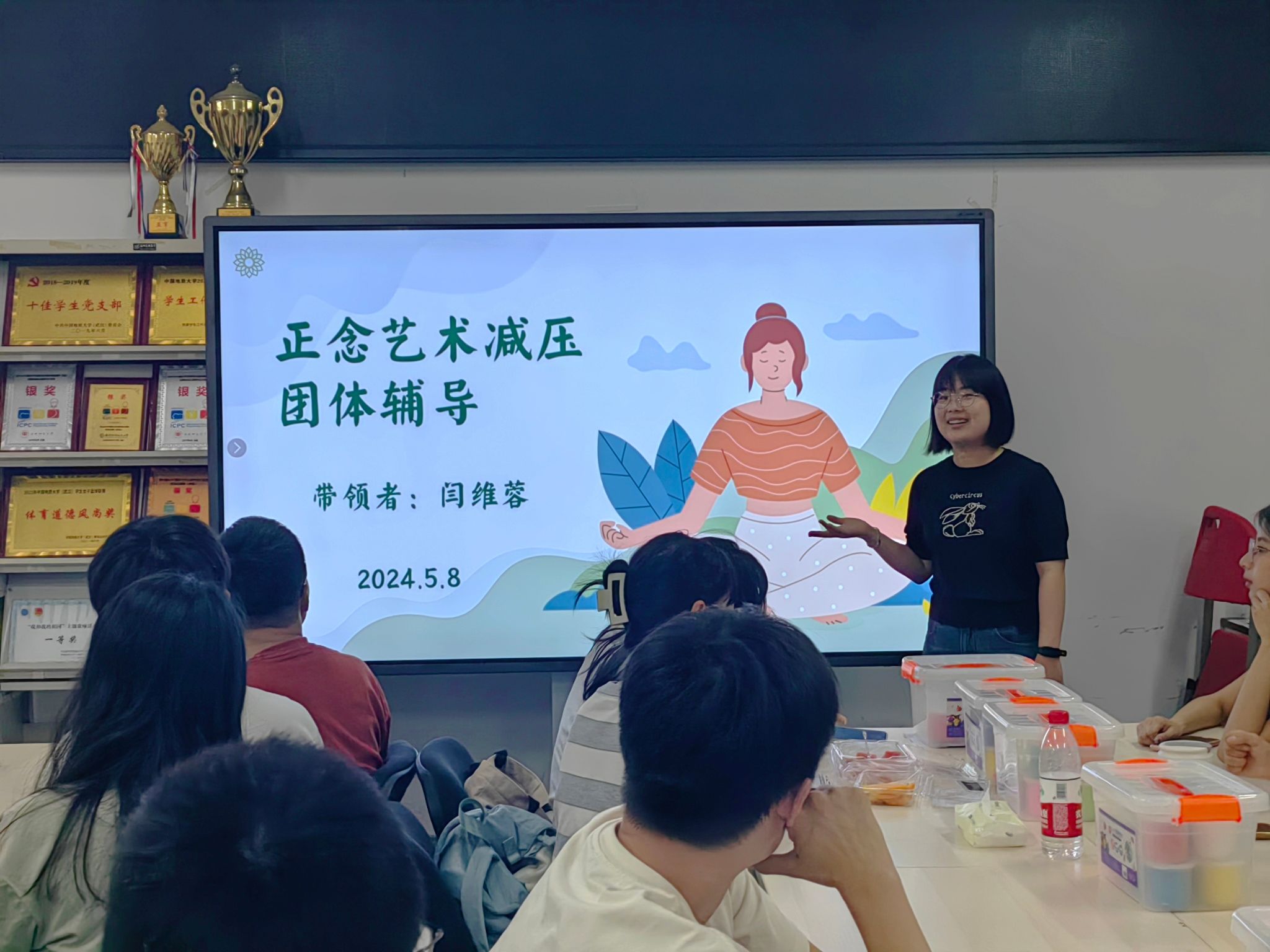 在5·25全国大学生心理健康日来临之际,为丰富学院心理健康教育活动,引导学生关注和呵护自身的身心健康,缓解工作学习带来的压力和紧张焦虑情绪,5月8日晚上,由beat365在线体育官网登录入口E心为你二级心理辅导站举办的5·25心理健康月系列活动之正念艺术减压团体辅导在beat365在线体育官网登录入口大楼101举行。学院党委副书记林小艳和20余名师生参与本次活动,活动由学院心理健康辅导员闫维蓉带领。