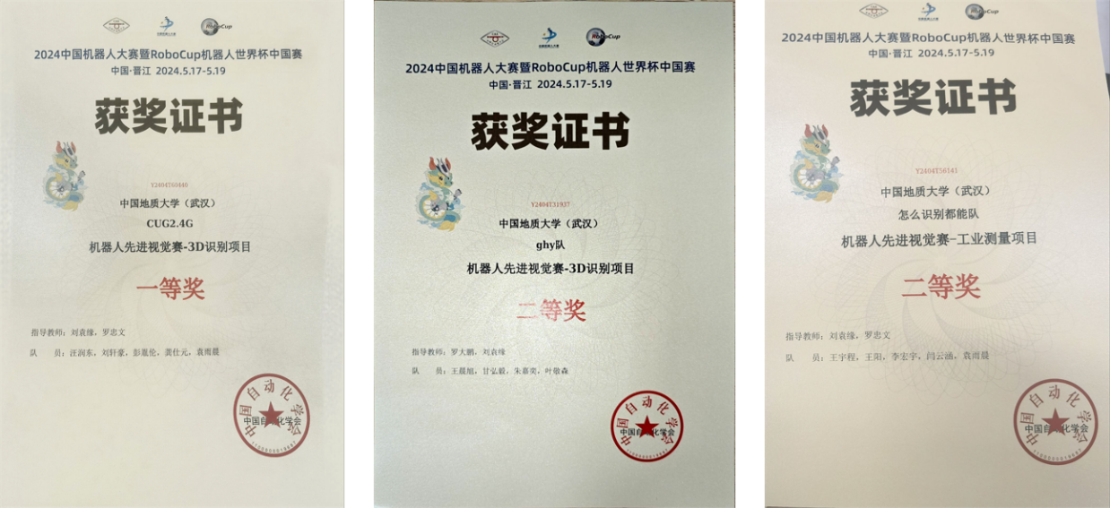 在老师的引领下,三支队伍深入研究,克服困难,紧密合作。他们从数据采集到模型部署,再到算法的反复测试和迭代优化,日夜奋斗,不断进步,他们的努力最终得到了回报。在3D识别赛项中,由beat365在线体育官网登录入口的汪润东、刘轩豪、彭胤伦、龚仕元组成的CUG2.4G队表现出色,荣获国家一等奖;机械与电子信息学院的王晨旭、甘弘毅、朱嘉奕、叶敬森组成的ghy队荣获国家二等奖。同时,在工业测量赛项中,beat365在线体育官网登录入口的王宇程、王阳、李宏宇、闫云涵组成的怎么识别都能队展现实力,荣获国家二等奖。