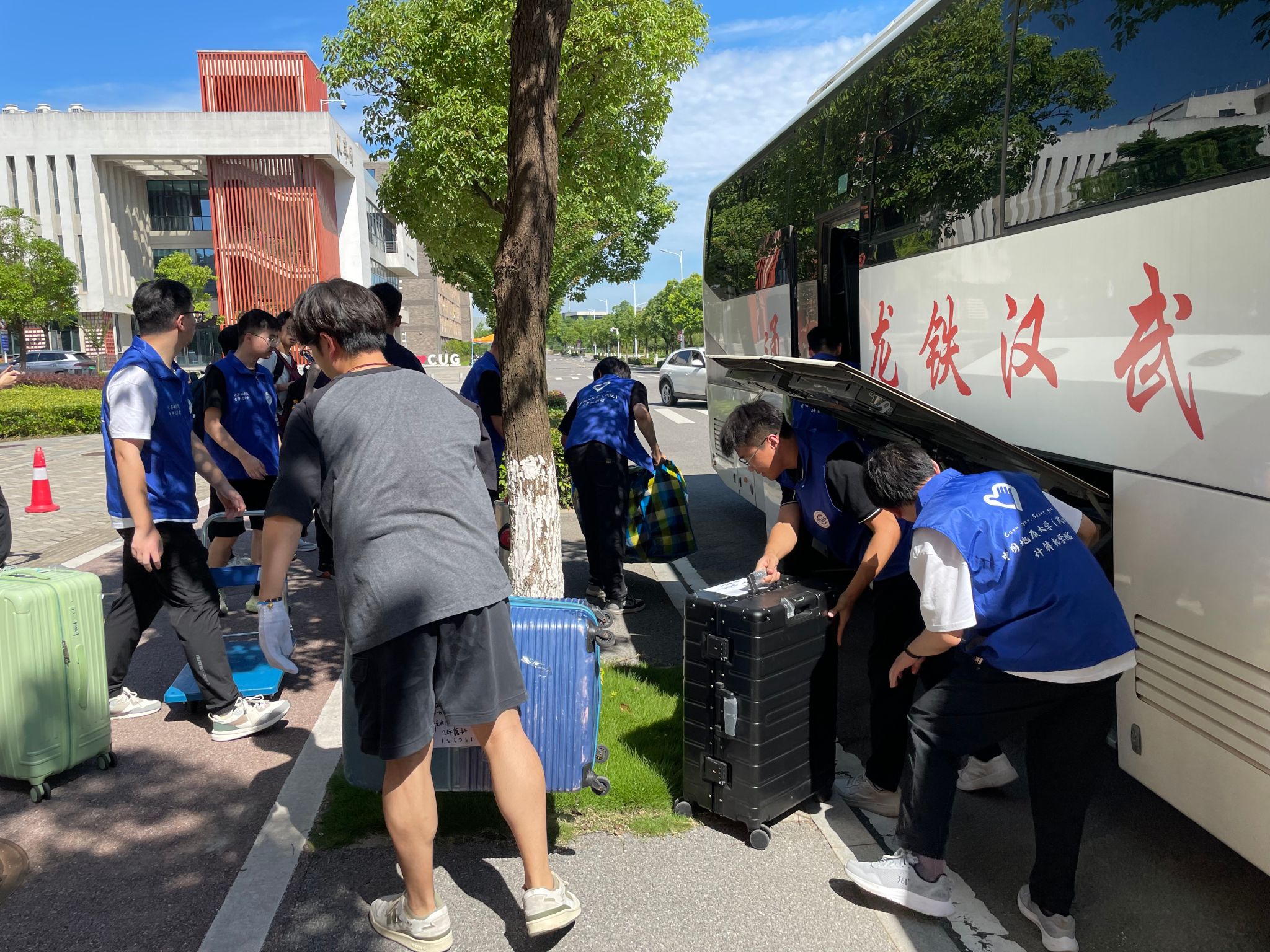 同学们早已打包好行李在楼下等待,随着搬运车辆逐次停下,大家自觉组成流水线相互接力,一件件纸箱、行李箱、储物袋最终被罗列得整整齐齐。尽管天气炎热,但大家的热情不减,许多男生主动帮助女生搬运行李,在各位老师的指挥下,一切都在有条不紊地进行。