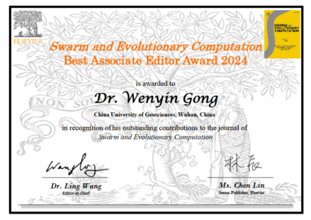 近日,beat365官网龚文引教授荣获中科院一区期刊《Swarm and Evolutionary Computation》2024年度最佳副编奖(Best Associate Editor Award),以表彰其对该期刊发展和群体进化计算领域研究的进步做出的杰出贡献。