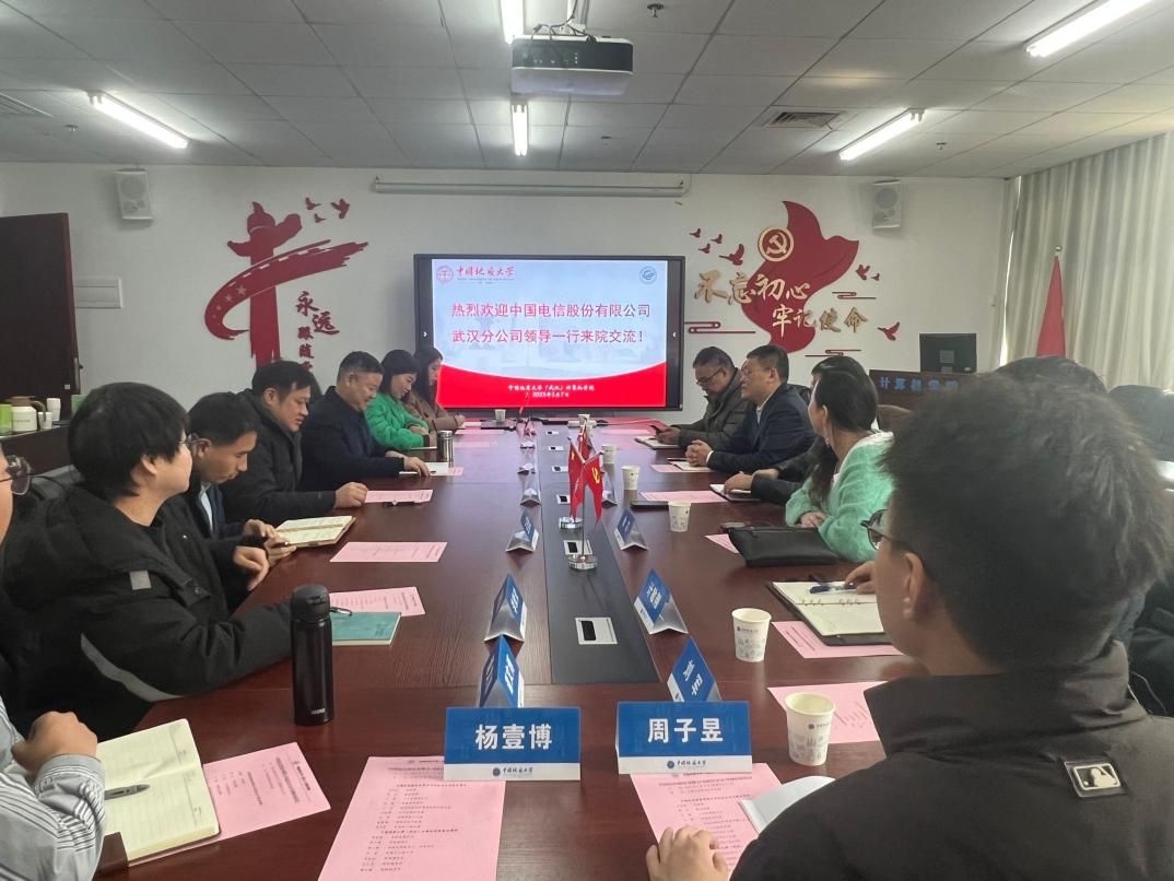 3月7日上午,中国电信股份有限公司武汉分公司来院调研座谈。双方在学院309会议室就校企合作、学生实习、就业等方面进行了深入交流。中国电信武汉分公司总经理代宏斌、副总经理覃兵、人力资源部主任石涛、校园部总经理吴峰等领导,beat365在线体育官网登录入口党委书记李国昌、副院长陈云亮、党委副书记林小艳等学院领导及辅导员代表参加会议。李国昌主持会议。