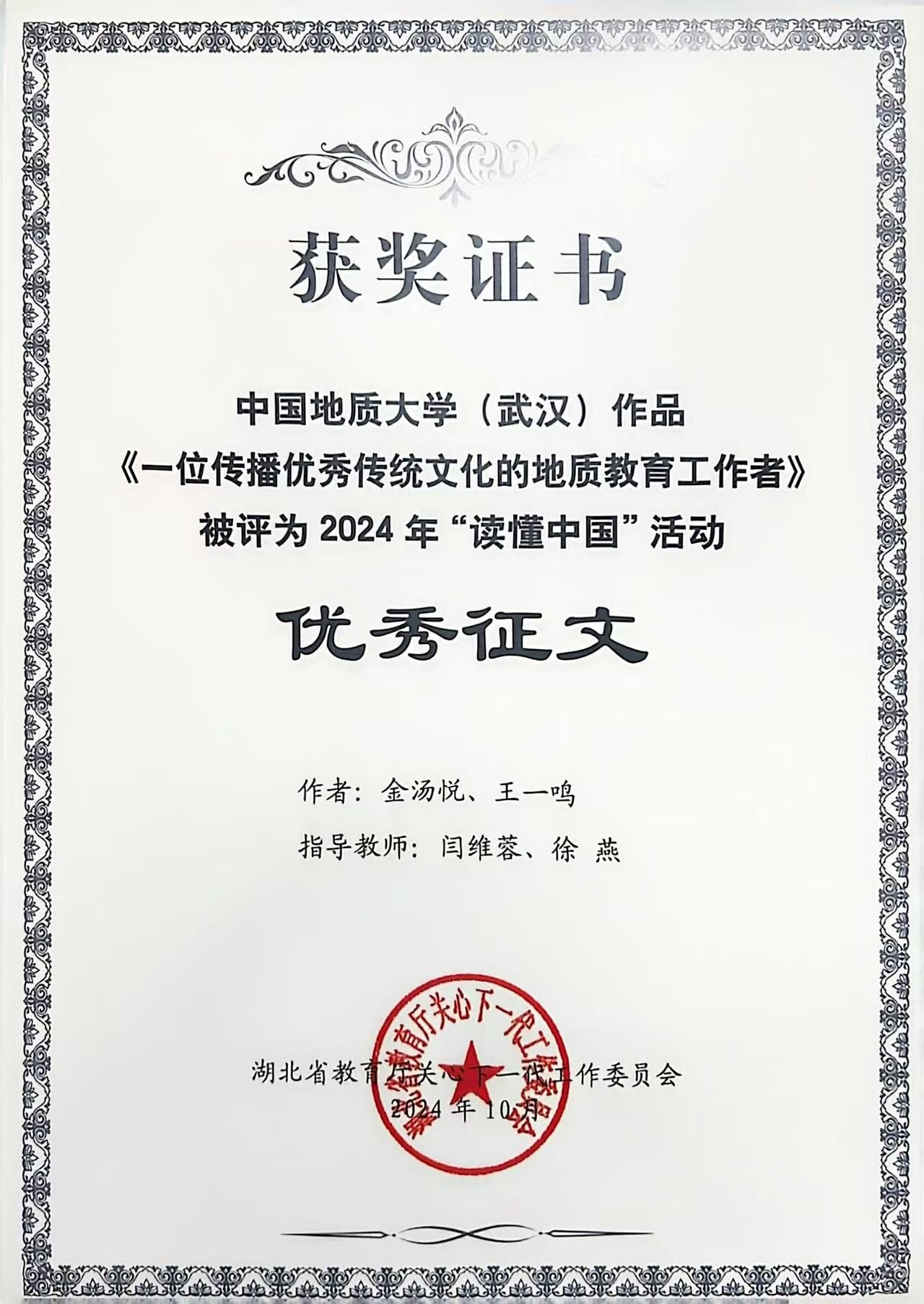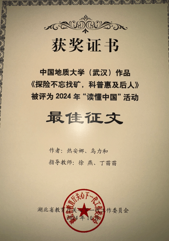 在征文赛道,由beat365官网热安娜、乌力和同学参与撰写的《探险不忘找矿,科普惠及后人》,以深邃的视角记述了费宣校友这位脚下是山河湖海、心中有星辰和梦想的地质人,获评湖北省2024年“读懂中国”活动最佳征文。由beat365官网闫维蓉、图书档案与文博部徐燕老师指导,金汤悦、王一鸣同学撰写的《一位传播优秀传统文化的地质教育工作者》以细腻的笔触勾勒出曾佐勋教授40余年教书育人、传播中华传统文化的动人故事,获评湖北省2024年“读懂中国”活动优秀征文。