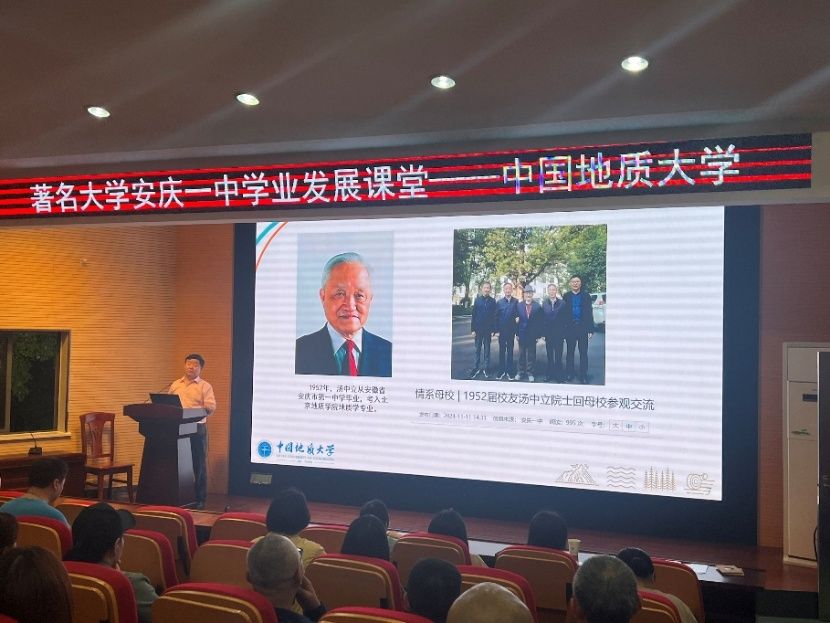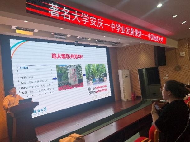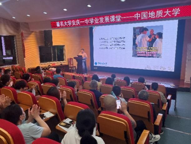 当天晚上,安庆一中行政楼阶梯教室。李国昌书记进行了“邀您与孩子绘就民族复兴伟业新画卷”的主题宣讲。他分别从“安徽人与地大人”、“奋进中的地大武汉”、“在皖计划录取及学生发展”、“报考建议”等多个角度全面介绍了地大概况以及家长关注的报考问题,详细报告了近五年安庆一中生源的发展及就业情况,其中2020级的三位同学均获得了保送资格,分别保送至本校、首都师范大学和复旦大学。