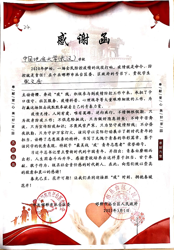 (通讯员:陈宝华)“疫情就是命令,防控就是责任!在中共邯郸市丛台区委、区政府的号召下,贵校学生柴文岳主动请缨,奔赴‘疫’线,积极参与到疫情防控工作中来,承担了卡口值守、社区服务、疫情科普、心理疏导等大量艰难细致的工作,为打赢这场阻击战默默奉献着自己的青春力量……”近日,beat365在线体育官网登录入口(武汉)收到一封中共邯郸市丛台区委、邯郸市丛台区人民政府发来的感谢函,对beat365在线体育官网登录入口191191班柴文岳同学在疫情防控期间的志愿服务表示感谢,授予他“最美战‘疫’青年志愿者”荣誉称号。