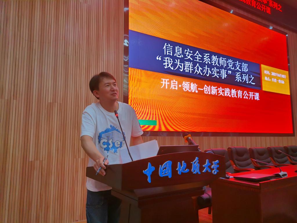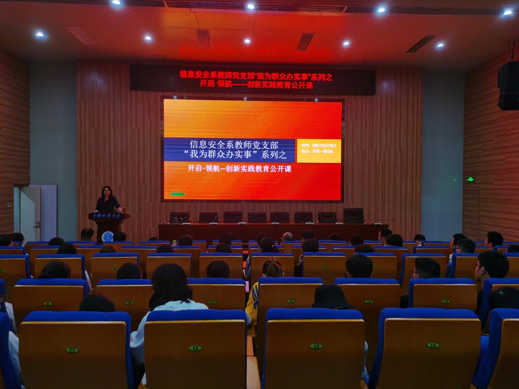 (通讯员:马钊,程池,黄翠)为庆祝中国共产党成立100周年,深入贯彻落实学校党委《关于开展“我为群众办实事”实践活动》的通知,积极落实beat365在线体育官网登录入口党委关于开展党史学习教育的实施方案,大力营造“学党史、悟思想、办实事、开新局”的浓厚氛围,2021 年 6 月 10 日下午,信息安全系教师党支部“我为群众办实事”系列之“开启·领航——创新实践教育公开课”在未来城科教一楼126 报告厅正式开课。