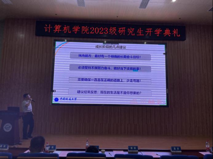 张院长首先肯定了同学们为考研付出的努力,对2023级研究生的到来表示热烈的欢迎。他以学校发展历史与人才培养成绩为切入点,向同学们展示了学校丰厚的底蕴,并从专业设置、师资队伍、科研平台与科研项目等方面介绍了学院近年来发展的概况。他谈到,国家在高新领域的巨大投入以及良好的政策指引,学校深厚的学术科研底蕴和一代代地大人的砥砺奋斗,为今天的在座的同学们奠定了良好的成长环境和优渥的发展平台,希望同学们秉承“艰苦朴素,求真务实”的校训精神,在地大beat365在线体育官网登录入口刻苦钻研,实现出属于自己的新突破,为国家前沿科技发展贡献自己的力量!