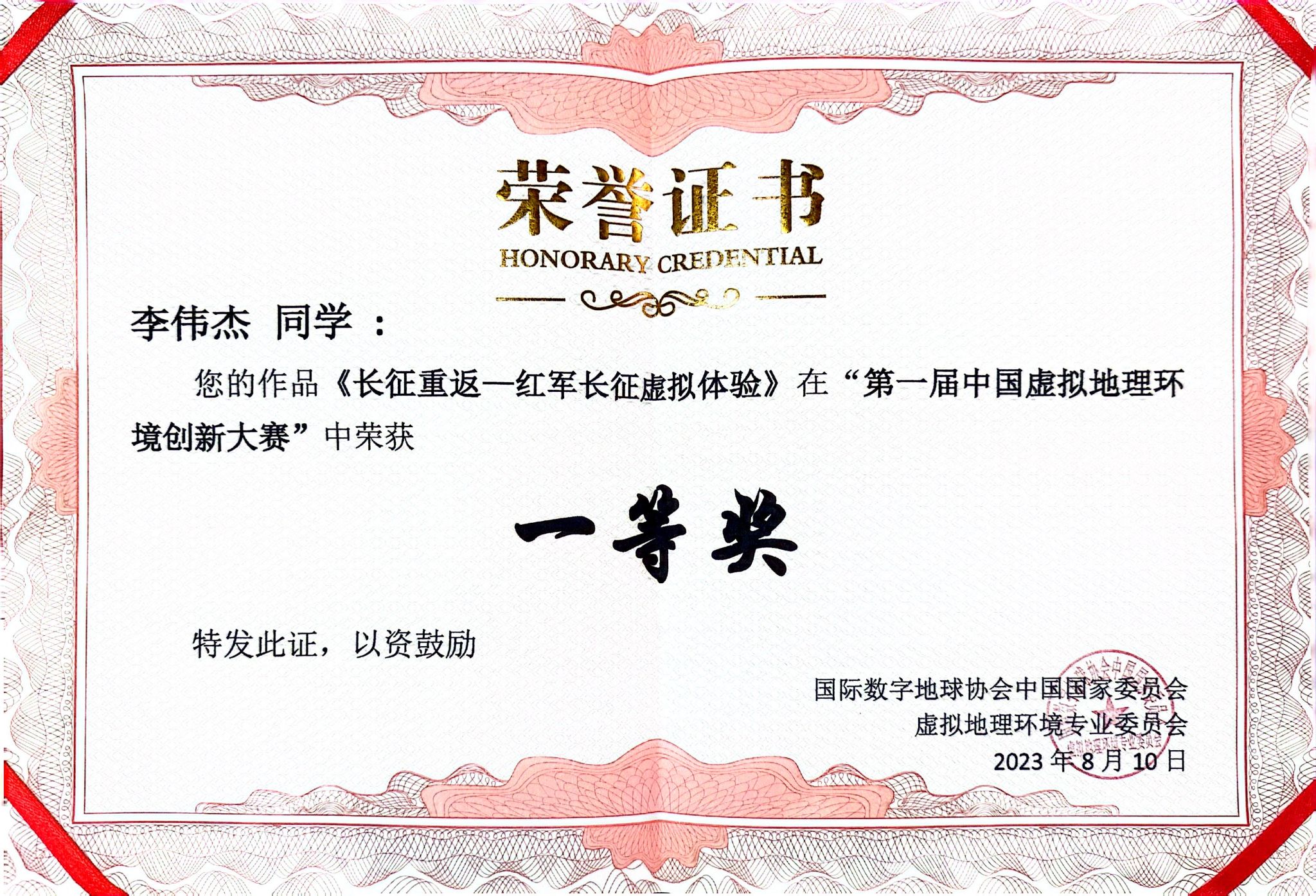 编者按:经过激烈的角逐,在吉林延边举行的2023年第一届中国虚拟地理环境创新大赛圆满落幕。beat365官网的李伟杰、郝孟璂、王洋、刘建东、郑诗语五位研究生组成的“长征重返-红军长征虚拟体验”团队在这场赛事中展现出色的实力,一举拿下创意原型赛道一等奖。以下是团队的参赛历程以及每位成员参赛过程中的感悟。