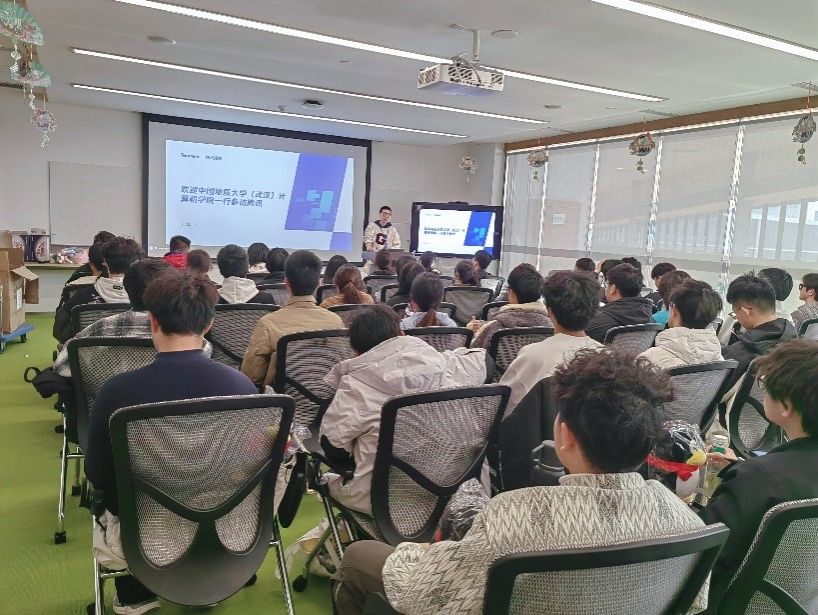 随后,大家来到会议室,腾讯武汉地区校园招聘HR蒋一晨与同学们进行了沟通交流。他为大家介绍了腾讯的成立背景、发展历程、校招流程及技术岗位的要求;分享了技术成长、职业晋升、面试技巧以及如何在校期间提升自身竞争力;讲解了腾讯在AI大模型、混元技术、地图游戏3D等领域的前沿探索。