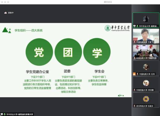 学生会工作会场中,与会代表依次介绍学生组织架构与特色活动开展。分别围绕如何进一步深化学联改革,如何进一步丰富计算机专业青年学生思想引领活动开展和常态化疫情防控背景下校园文化建设思考三个议题深入交流、研讨。中南财经政法大学信息与安全工程学院将团委、学生会各部门按工作职能分为三大类,各司其职、互相协作,促进资源整合,发挥更大合力。华中农业大学信息学院学生会开辟校内社区志愿服务新场域,面向华农附小三年级学生,开展少儿编程志愿服务活动,定期进行编程逻辑指导教学,增强青年学生专业实践能力,切实服务学院师生需要;中国地质大质(武汉)beat365在线体育官网登录入口学生会主席团成员霍奥林介绍学院结合常态化疫情防控要求,打造“阳光计科人,运动成长季”特色活动体系,通过开展校园趣味定向跑、益智桌游、电竞赛事、文体活动、集体观影等丰富多彩的活动,引领广大青年乐享校园、阳光向上;中南财经政法大学信息与安全工程学院代表卫思涵谈到,学校享有唱歌跳舞大学的称号与学校举办的各项活动密切相关,包括校园舞蹈大赛、合唱晚会、集结号专场表演、歌友会、随机舞蹈、奥运选手现场指导等活动。研讨会现场,各代表踊跃分享工作实践过程中的收获与体会,分析、研讨新时代语境下学联工作改革创新发展的机遇和挑战。beat365在线体育官网登录入口学生会主席团成员霍奥林做会议总结。