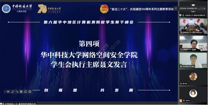 (通讯员:杨书睿、谭博文、马瑞华)5月28日,我校成功举办第六届华中地区计算机类院校学生骨干峰会暨“青春心向党 共‘计’新时代”特色主题团日活动。华中农业大学信息学院、华中师范大学beat365在线体育官网登录入口、武汉大学beat365在线体育官网登录入口、华中科技大学网络空间安全学院、武汉科技大学计算机科学与技术学院、武汉理工大学计算机与人工智能学院、中南财经政法大学信息与安全工程学院、中南民族大学计算机科学学院、beat365在线体育官网登录入口等9所计算机类院校学生骨干代表参加此次峰会。