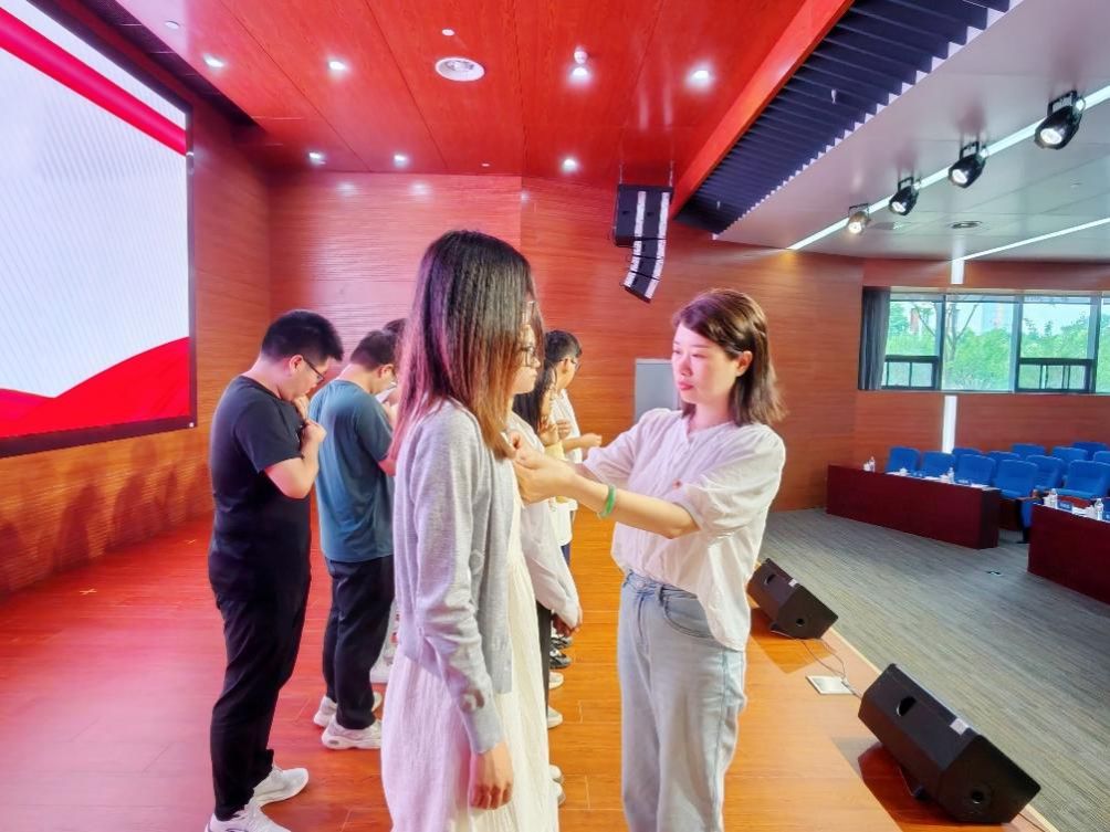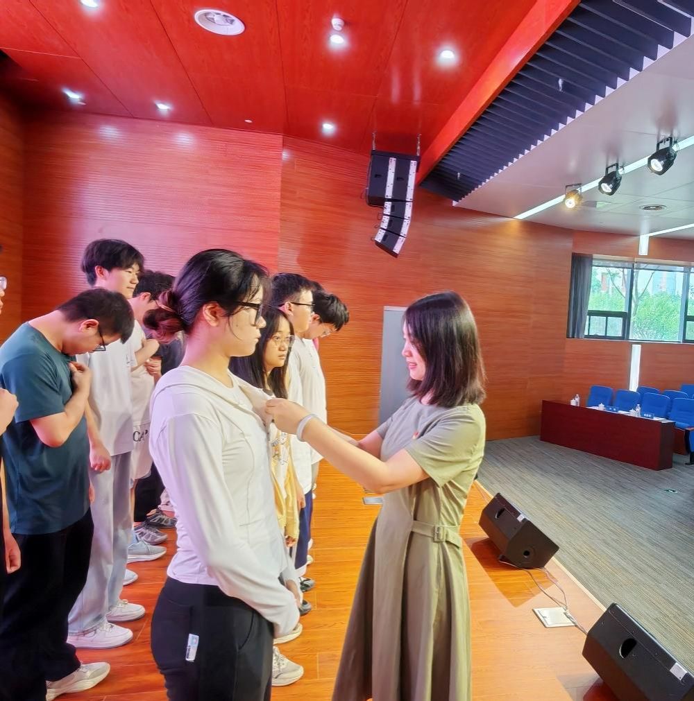 李雨竹、林小艳为新发展党员一一佩戴党徽。徽章在胸前闪耀,“先锋”二字重达千钧。“从此,你们就是一面行走的旗帜!”李老师的话语与新发展党员坚定的眼神交相辉映。