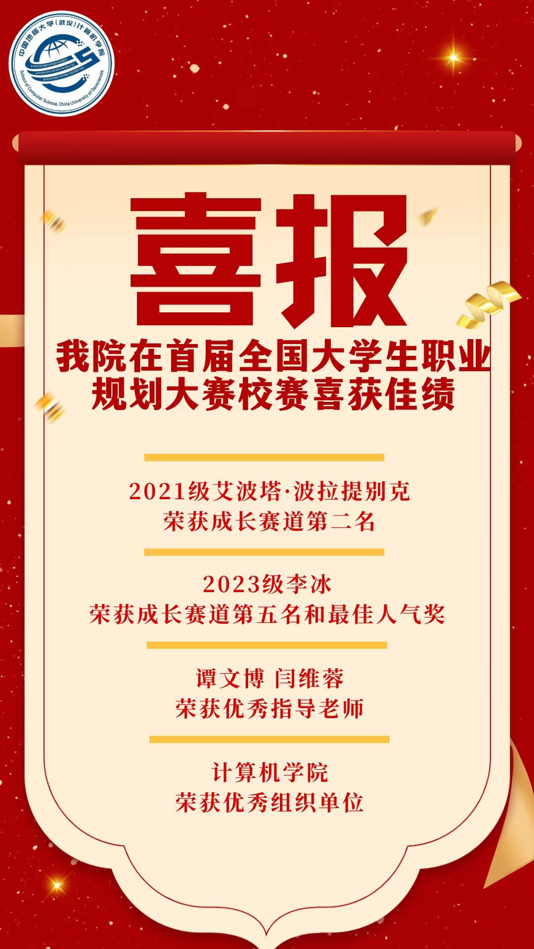 在激烈的校内决赛中,beat365官网表现尤为出色:21级艾波塔·波拉提别克荣获成长赛道第二名,23级李冰荣获成长赛道第五名和最佳人气奖;21级辅导员谭文博,23级辅导员闫维蓉荣获优秀指导老师,beat365在线体育官网登录入口荣获优秀组织单位。