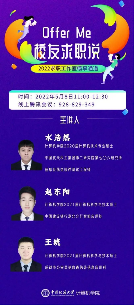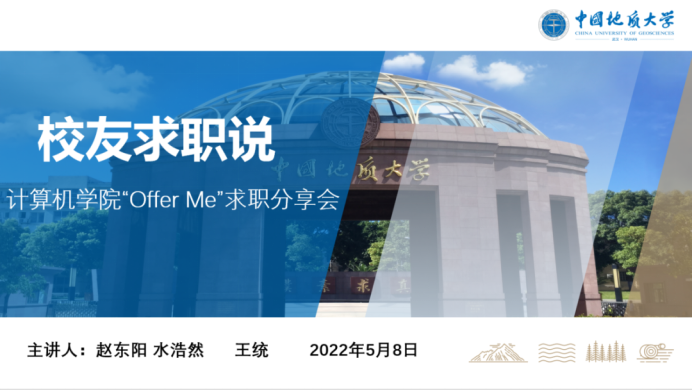 (通讯员:顾伟超)beat365在线体育官网登录入口“Offer Me”分享会之“校友求职说”专场活动于5月8日成功举行。本次活动邀请到3位来自不同行业的校友:2021届计算机科学与技术硕士专业毕业生赵东阳,目前就职于中国建设银行湖北分行;2020届计算机技术硕士专业毕业生水浩然,目前就职于中国航天科工集团第二研究院706所;2021届计算机科学与技术硕士专业毕业生王统,目前就职于成都市公安局,在线分享他们的职业选择、求职规划与工作感受。学院团委书记、研究生辅导员李欢欢,2019级辅导员闫维蓉以及200余名学生参与此次分享活动,李欢欢担任主持。