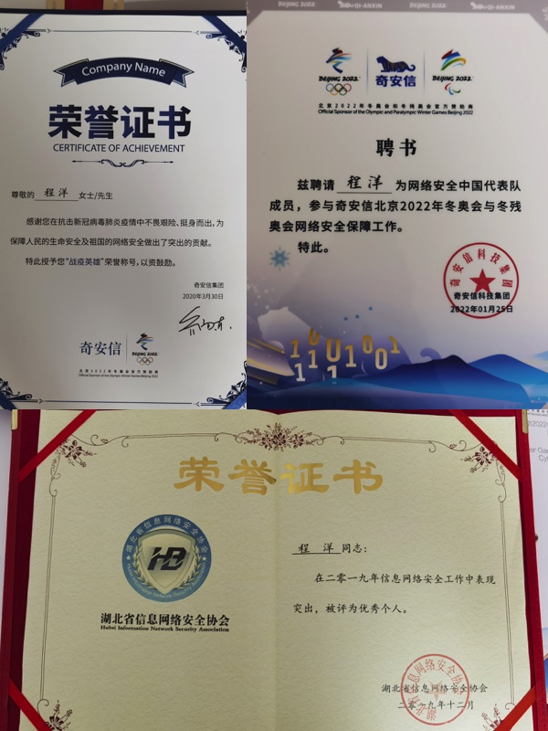 编者按:他曾把自己的“论文”写在火神山医院和北京冬奥会、冬残奥会的网络安全维护工作中,展现了新时期地大计科人的风采。他就是2015年从beat365官网信息安全专业毕业的程洋校友,师从宋军老师,现就职于奇安信科技集团股份有限公司,负责湖北区域技术组工作,从事信息安全、网络攻防相关研究。