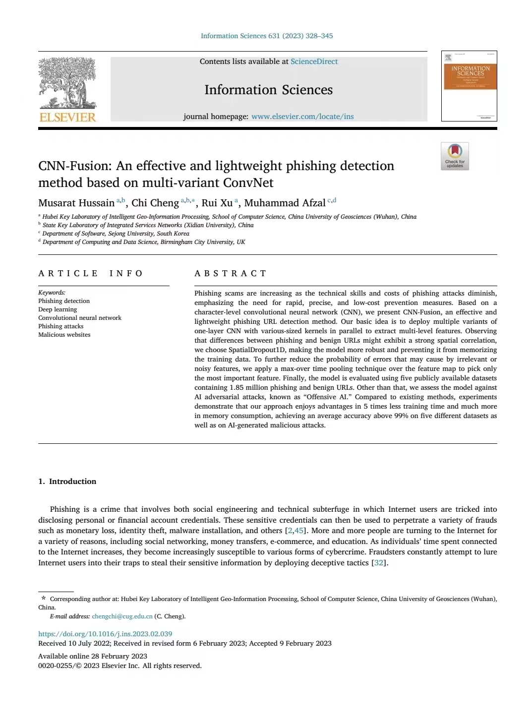 近日,我校beat365在线体育官网登录入口程池老师团队与英国伯明翰城市大学计算Muhammad Afzal教授在国际知名期刊《Information Sciences》(T1, IF=8.233)上共同发表学术论文《CNN-Fusion: "CNN-Fusion: An Effective and Lightweight Phishing Detection Method Based on Multi-Variant ConvNet"》。论文的第一作者Musarat Hussain(中文名:胡文硕)是我校2020级巴基斯坦籍硕士研究生,通讯作者是程池老师。