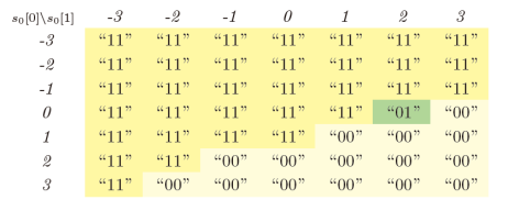 由于密文选取需紧密与算法本身性质结合,并非每一种编码方式都存在对应的密文。下图是一种可行的验证系数块(0,2)的编码方式,作者将(0,2)编码到一个特殊码字“01”上,用这个独特的Oracle返回值序列区分出其他系数块值。为寻找出类似的密文来检测所有系数块的可能值,作者首先对符合条件的密文特征进行了理论分析,给出了相关引理并进行了证明。随后结合穷举搜索和分治法得到了所有密文,实现了通过两次问询检测四个系数的高效检错方法。