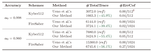 论文采用了模拟实验和板上实验相结合的方式进行评估与验证,并与多数投票消错(Ravi等人在CHES2020上使用)以及波形聚合消错(Ueno等人在CHES2022使用,为目前最好结果)两种方法进行了对比。实验结果表明,该论文中方法相比于后者可以减少45.9%, 55.4%的总问询次数。在此同时,类似于Ueno 等人的效果,该论文提出的方法可以成功恢复几乎全部的多项式系数,即在512个系数中平均只有0.04或0.05个发生错误。