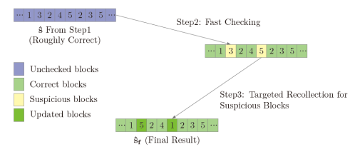 该论文基于的攻击模型是第一大类中的Plaintext-Checking Oracle-based Attack,也可称为Key Mismatch Attack。论文关注了侧信道分析在具体实践中的所面临的额外挑战:受环境噪音、测量方式等因素影响,获取到的信息比特可能翻转,进而导致恢复的密钥出现差错。传统的做法通常通过多数投票、或波形聚合等方法来确保密钥恢复的准确性。在论文中作者提出了一种新的解决方案,对基于格构建的KEM算法具有一定通用性,其基本思想是:粗粒度恢复-检错-纠错。与论文标题“Find the Bad Apples”对应,这一思路最大的挑战在于设计“检错”步骤。作者借助已恢复的私钥信息进行密文重构设计了一套特殊的“检错”密文,并运用了编码的相关理论在原有的攻击模型(即Oracle)下完成了一套检错方案。