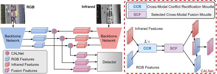 多光谱物体检测因其在全天候应用中的潜力而备受关注,特别是那些涉及可见光和红外图像的应用。尽管在这一领域取得了长足进步,但目前的方法主要依赖于简单的累加操作来组合来自不同模态的互补信息,忽略了模态间内在异质性所产生的语义冲突。为了解决这个问题,我们提出了一种新型跨模态冲突感知学习网络(CALNet),它考虑到了多模态输入中的语义冲突和互补信息。我们的网络由两个关键模块组成:跨模态冲突矫正模块和选择性跨模态融合模块。跨模态冲突矫正模块通过检查类似像素的上下文信息来缓解模态异质性,从而减轻存在语义冲突的多模态信息。随后,将语义一致的信息提供给选择性跨模态融合模块,该模块通过评估模态内的重要性来选择语义丰富的特征,并挖掘模态间的互补信息,从而融合多模态特征。为了评估我们提出的方法的有效性,我们开发了一种基于CALNet的双流单级检测器,用于多光谱物体检测。综合实验结果表明,我们的方法在解决跨模态语义冲突问题方面优于现有方法,并在检测结果的准确性方面达到了最先进的水平。