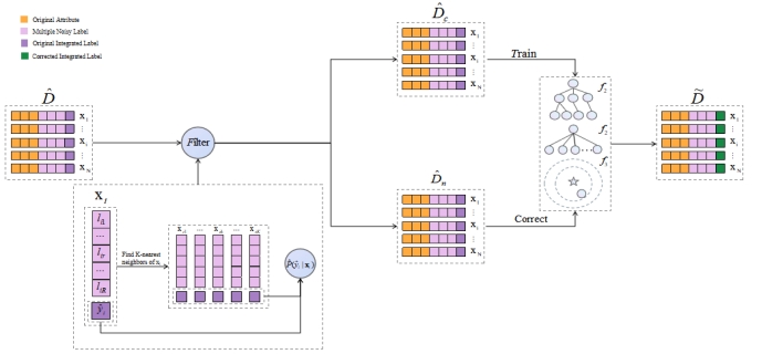 在众包场景中,可以从不同的众包工人那里获得每个实例的多噪声标记集,然后使用标记集成算法来推断每个实例的集成标签。尽管标记集成算法是有效的,但在集成标签中仍存在一定水平的噪声。为了减少噪声的影响,研究学者提出了许多噪声校正算法。然而,几乎现有的噪声纠正算法都只利用每个实例自己的多噪声标记集。而最近的研究表明,实例的空间结构也有助于识别和纠正噪声。因此,提出了一个新颖的噪声纠正算法——Neighborhood Weighted Voting-Based Noise Correction for Crowdsourcing (NWVNC),尝试利用每个实例邻居的多噪声标记集去识别和纠正噪声实例。为了充分利用每个实例的多噪声标记集的信息,NWVNC首先根据多噪声标记集计算实例权值。然后,利用KNN算法为每个实例找到K个邻居(包括它自己),根据每个实例的K个最近邻居的权值去估计属于它自己集成标签的概率,从而识别出干净实例和噪声实例。最后,NWVNC在干净实例上训练三个异质分类器,并通过一致投票的策略来校正噪声实例。经实验验证,NWVNC显著优于现有最先进的噪声校正算法。
